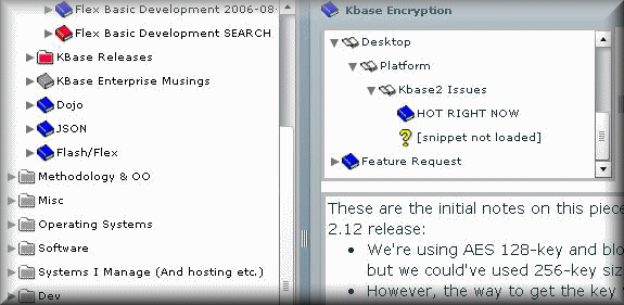 Your Kbase, Always Accessible and Shareable A true Web 2.0 application that requires no download, TheKBase Web works on the Web, making your data accessible from anywhere. To start with, your Kbase is private. When you're ready, "invite" other other TheKbase Web users to share your data. This allows for real-time collaboration in complex multiple-hierarchical structures. You may also publish your Kbase to the world, giving users and non-users a chance to look at -- but not modify -- your kbase. Public Kbase URLs are keyed so that you can decide to whom to give read only access. TheKBase Web uses a proven Web-Services-based architecture and a Flash-based client to give the user a desktop-like experience in a Web 2.0 application.